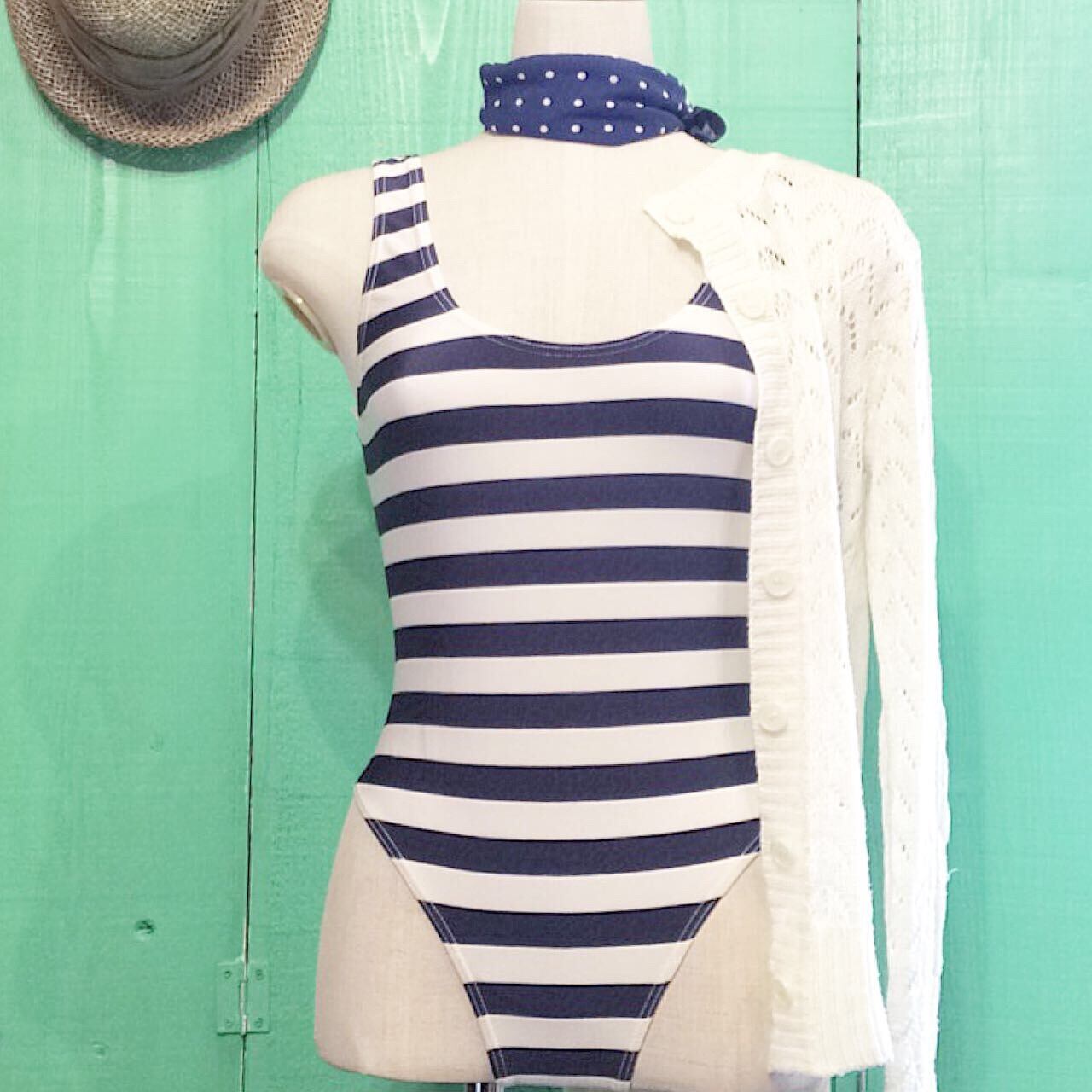 紺色と白のボーダーに、紺色と白の水玉のリボンがとてもキュートです。