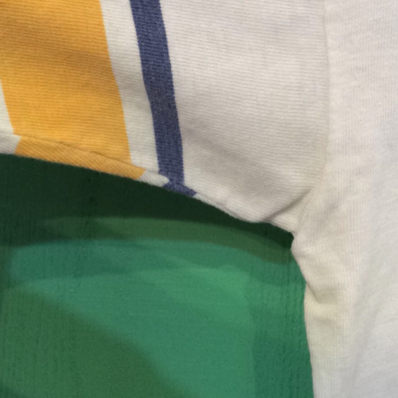 袖の黄色と紺色の色が 両脇に色移りしていますが、