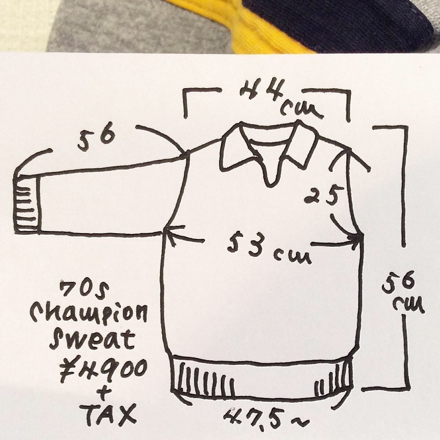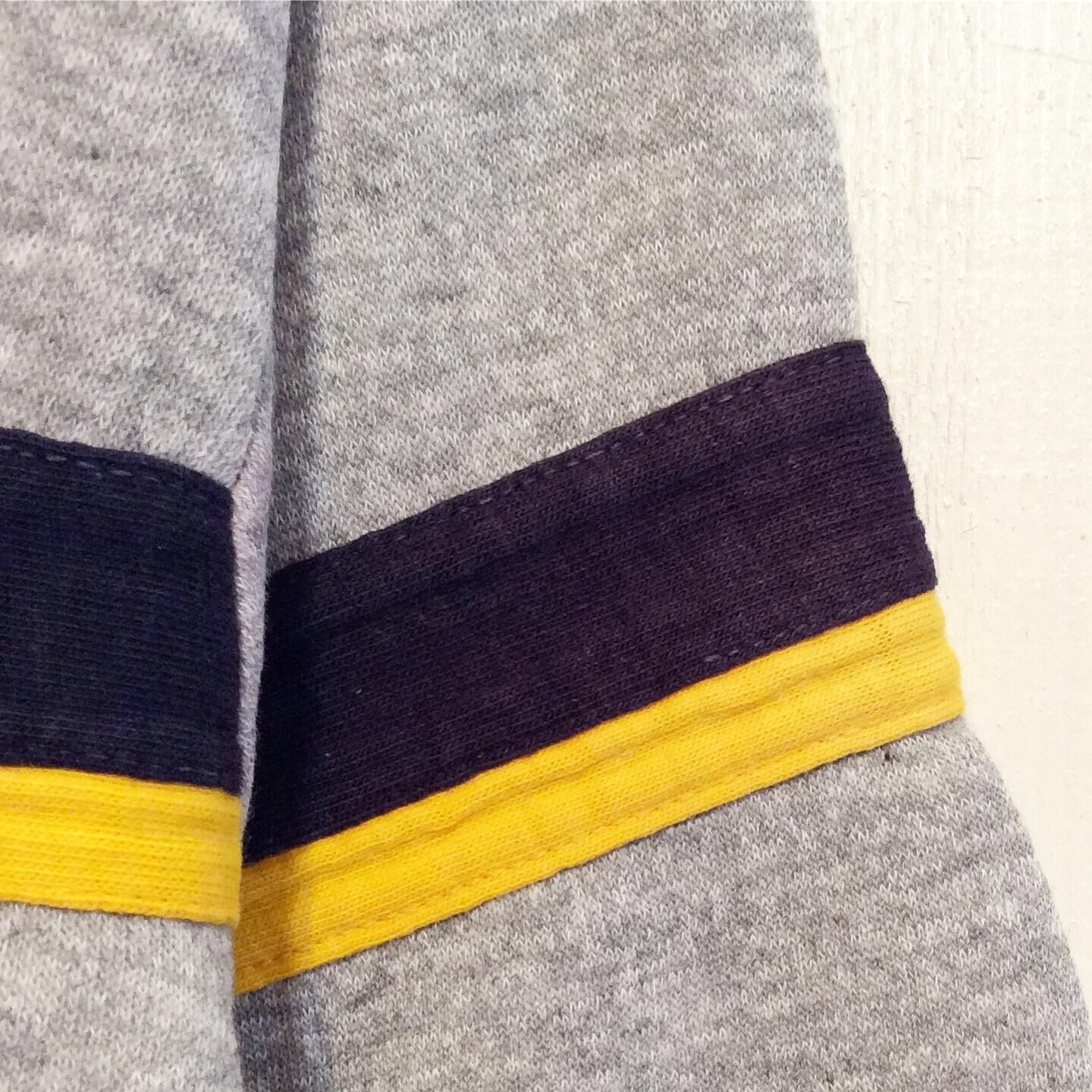 前身頃と 袖の紺色と黄色のラインはTシャツの様な素材のテープが縫い付いています。