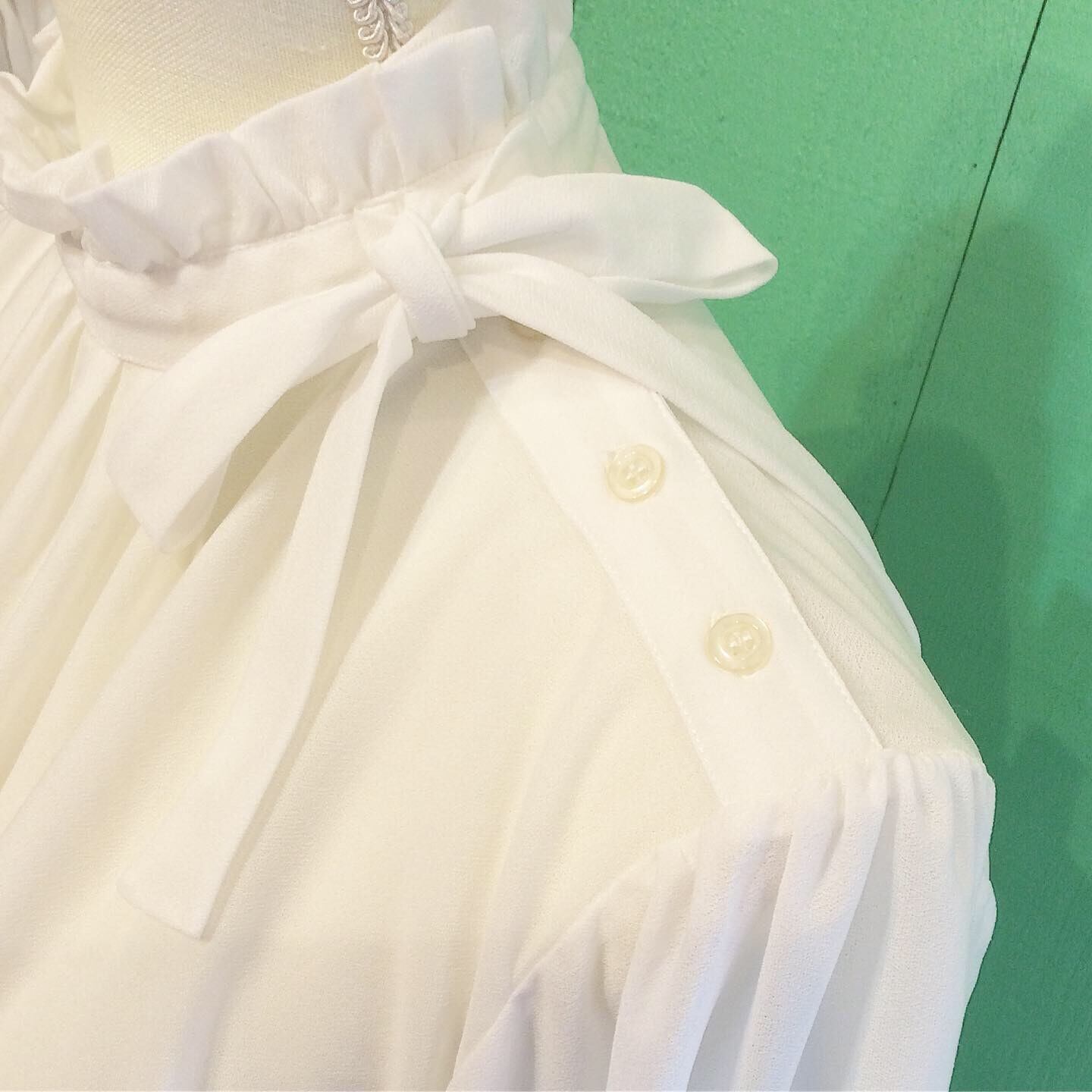 フリル付きスタンドカラーにリボンが付いていて