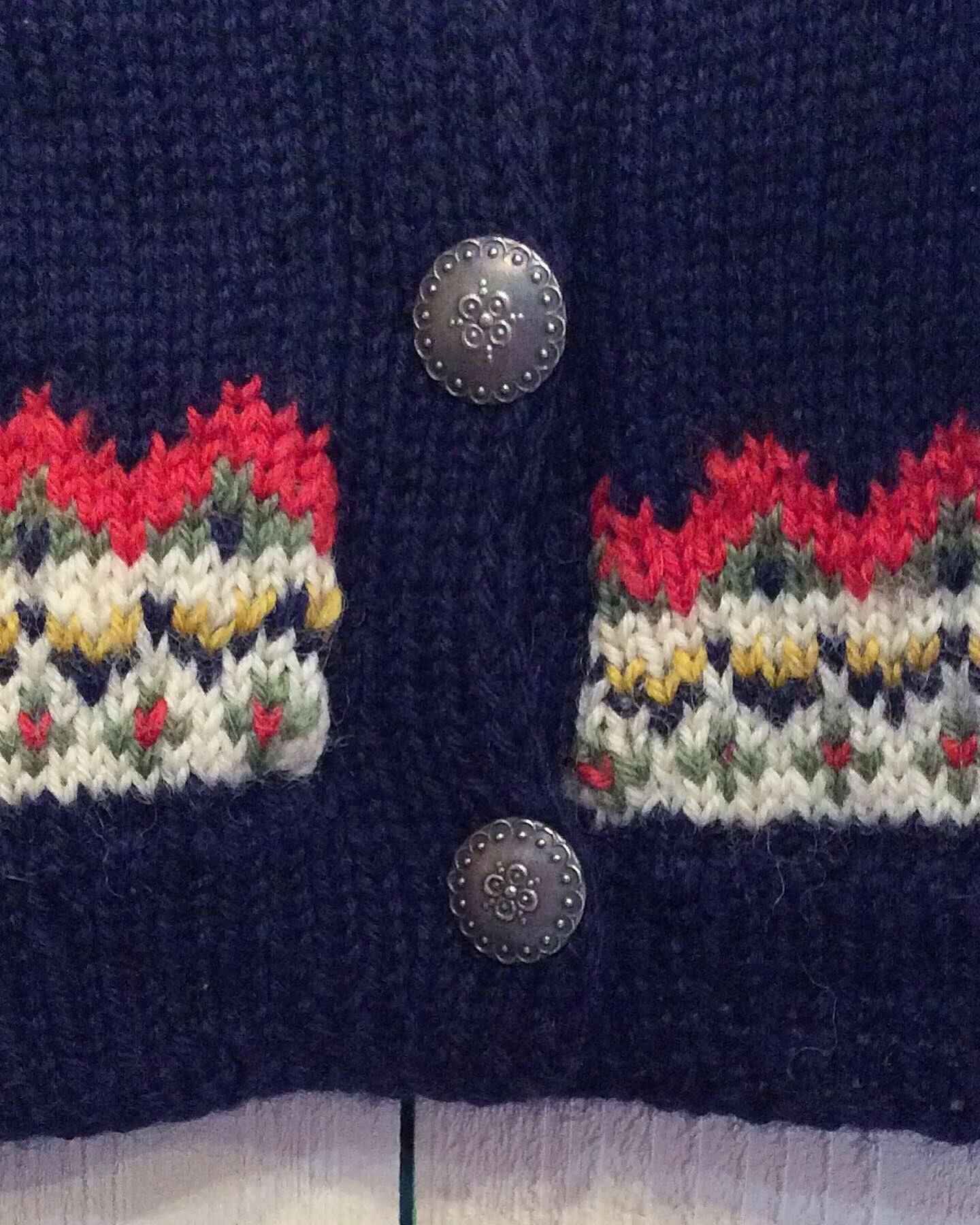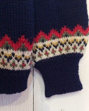 深い紺色がベースで、赤・カーキ・オフホワイト・カラシ色・黒などの毛糸で編み込まれています。