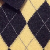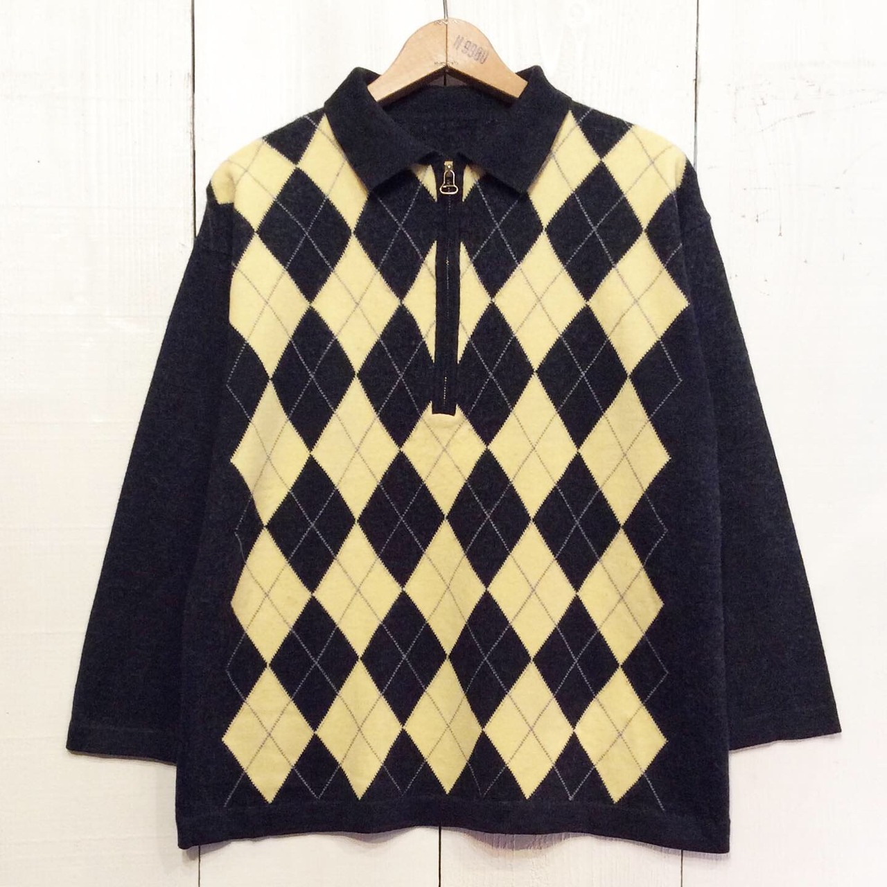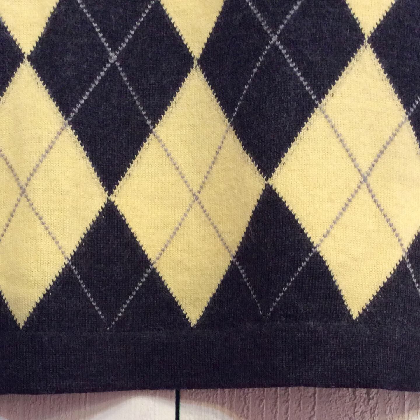 身頃が暖かみのあるライトイエローとチャコールグレーとライトグレーのアーガイル柄で、