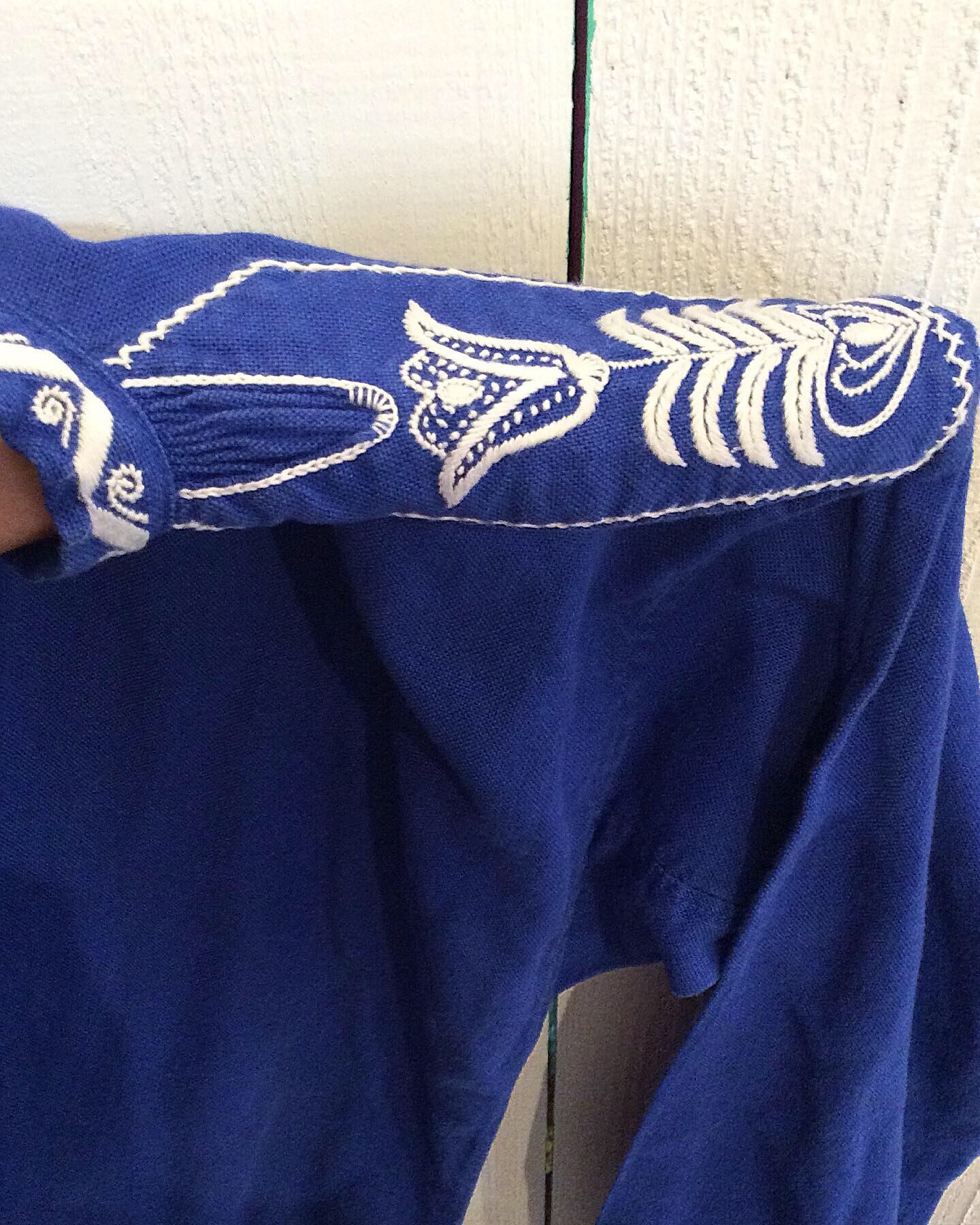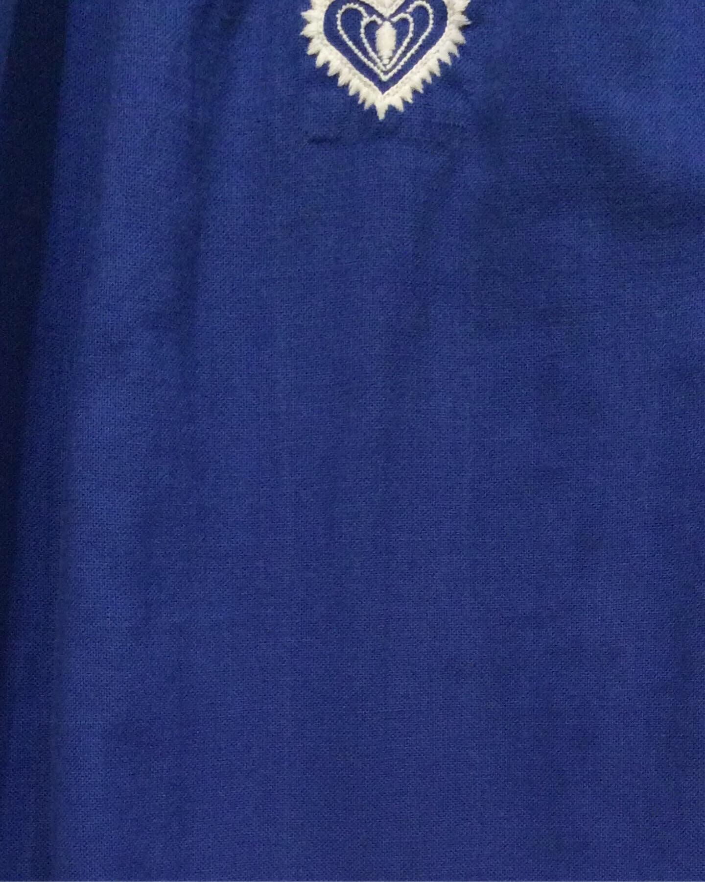 素材は厚めの青のコットンに、白のコットン糸の刺繍です。
