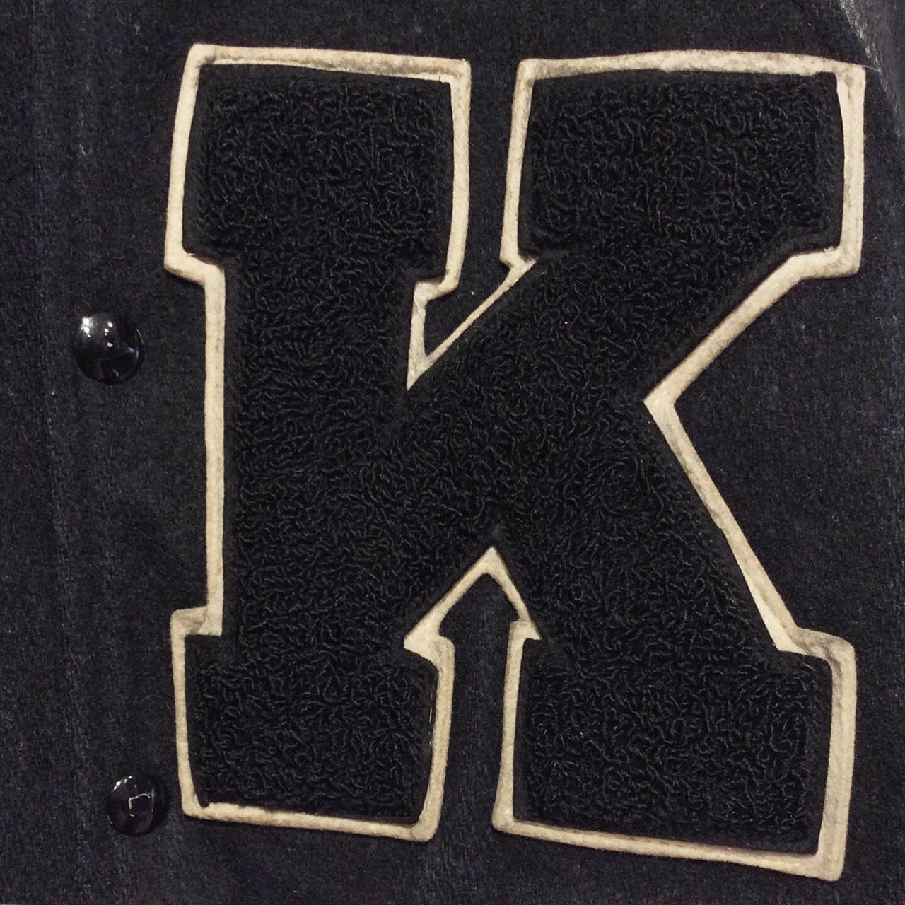 ワッペンが薄汚れた白と黒のフェルトにウールの黒のKの文字