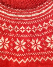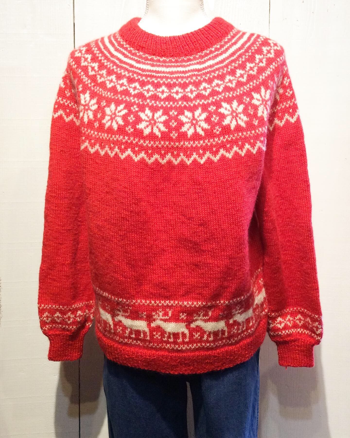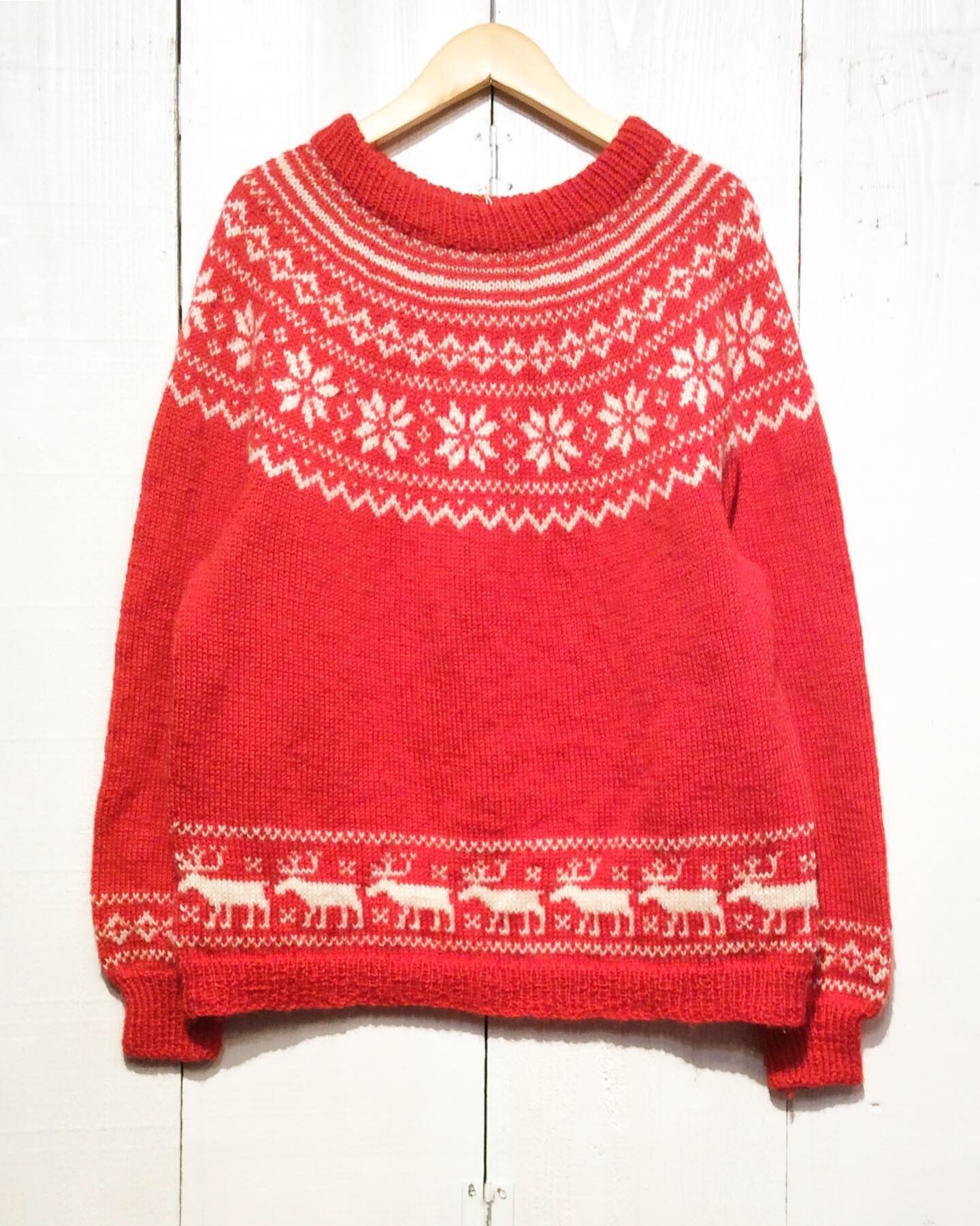 眩しいほどの 真っ赤な赤に、オフホワイトの雪柄とトナカイが とても可愛いセーターです。