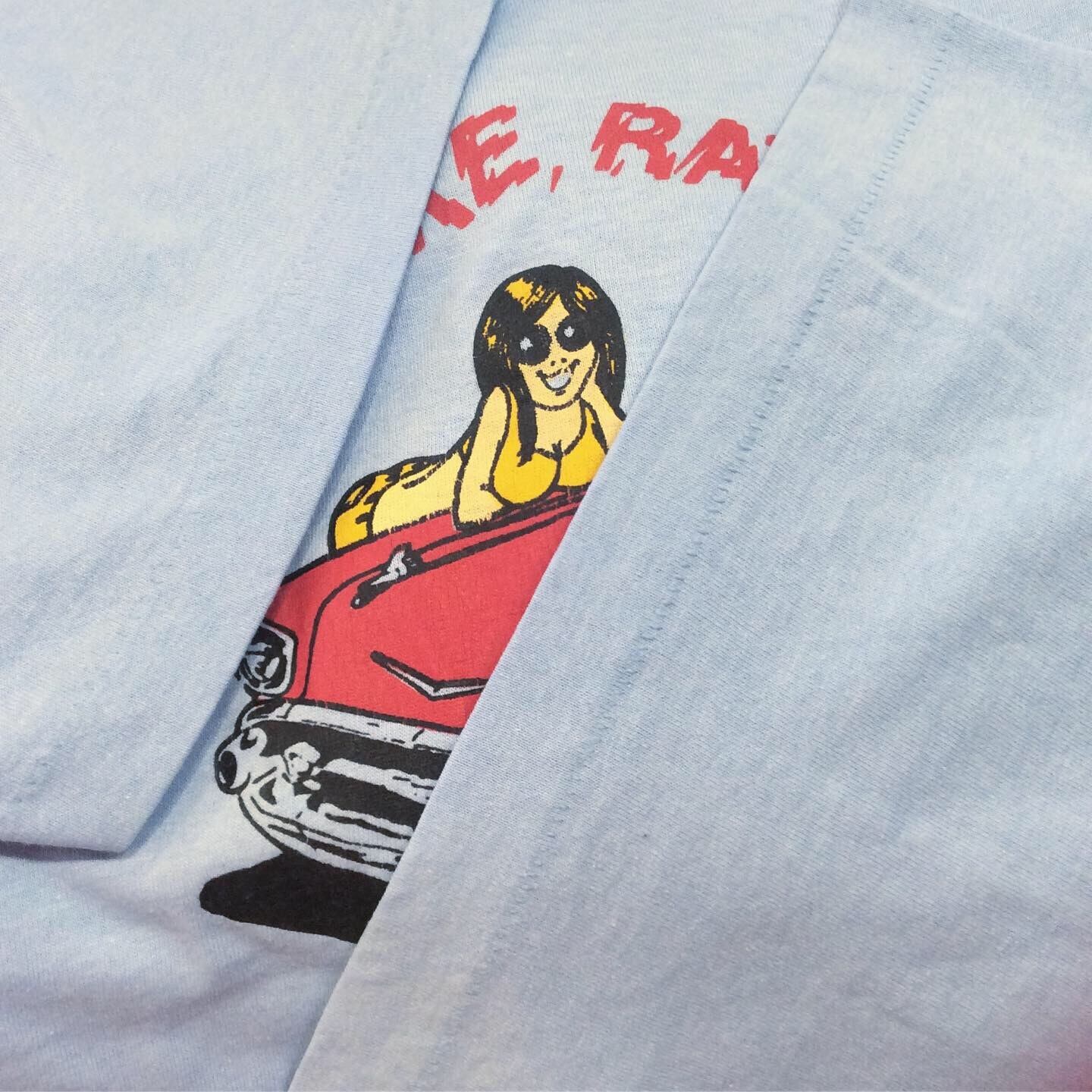 アメ車とキュートな女性の可愛い絵で、プリントの素材はラバープリントです。