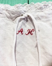 首元には 赤のクロスステッチの刺繍で"A.K"の文字が入っています。