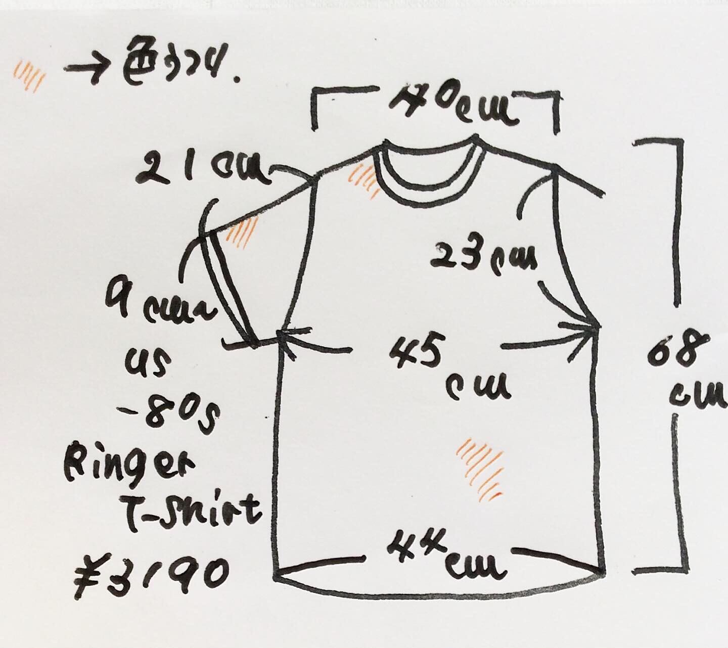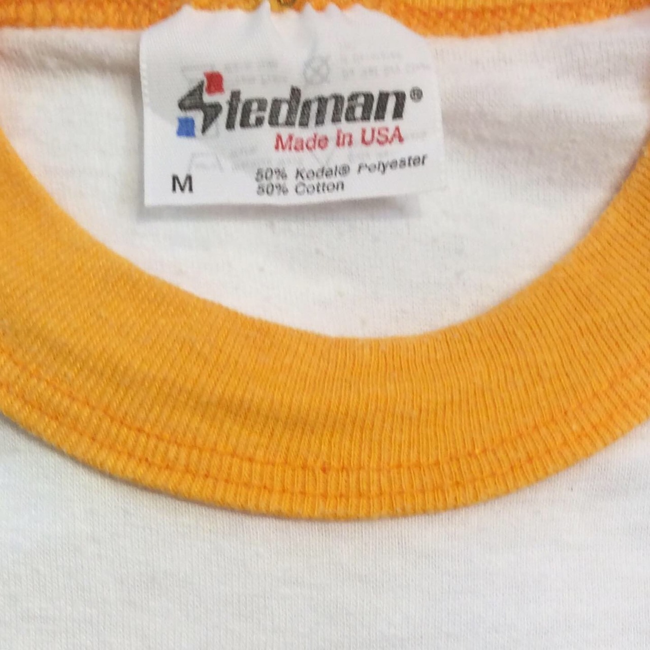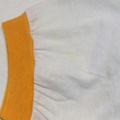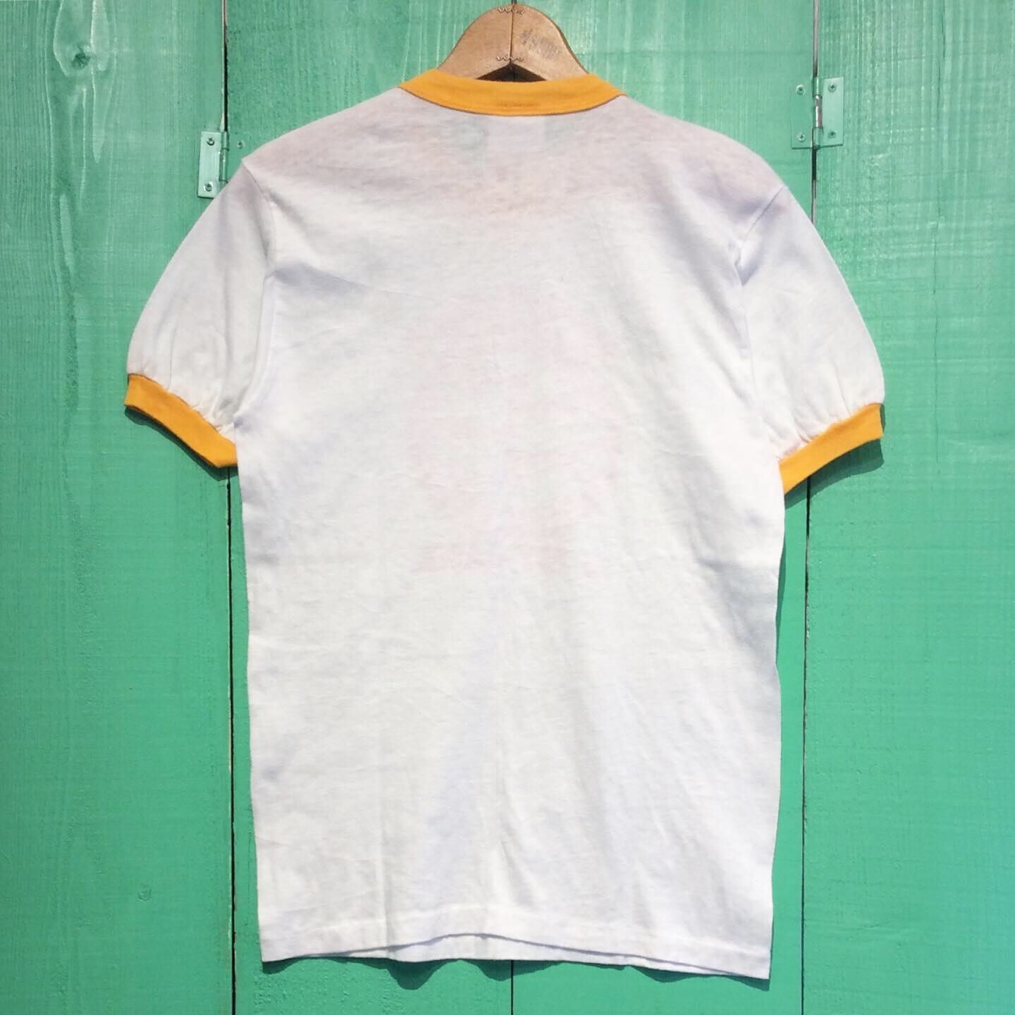 白のボディに首まわりと袖口まわりに黄色のトリムのついたリンガーTシャツです。