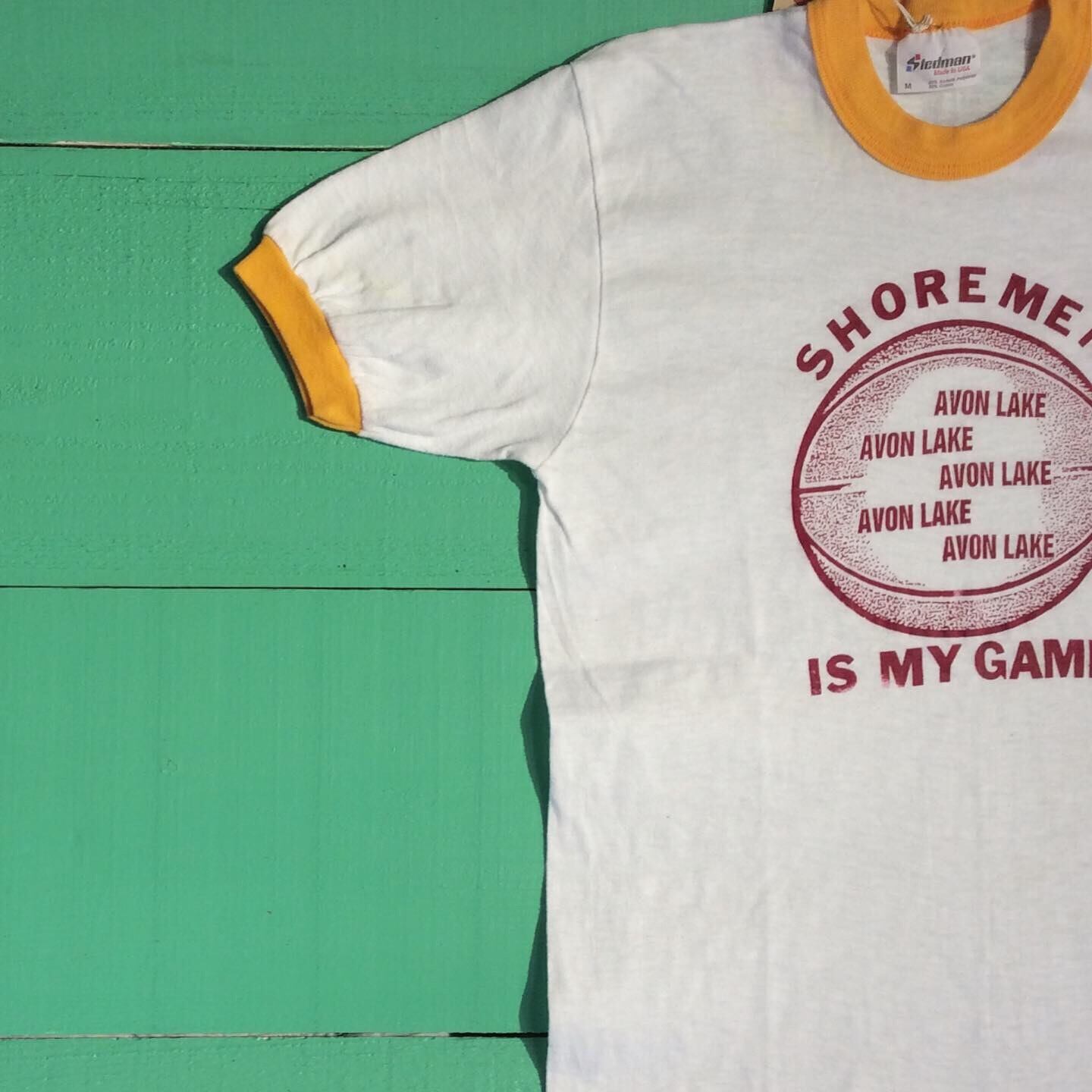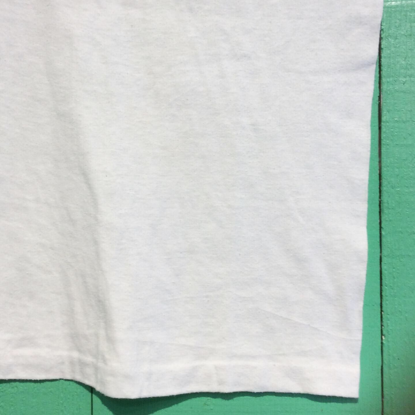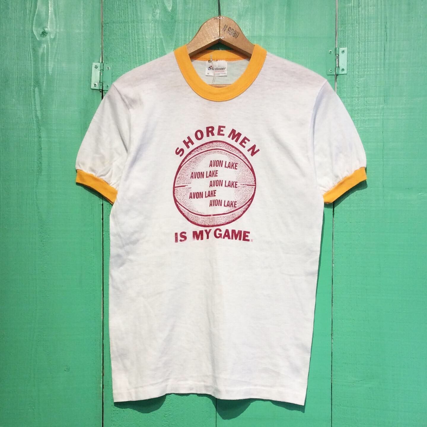 白のボディに首まわりと袖口まわりに黄色のトリムのついたリンガーTシャツです。