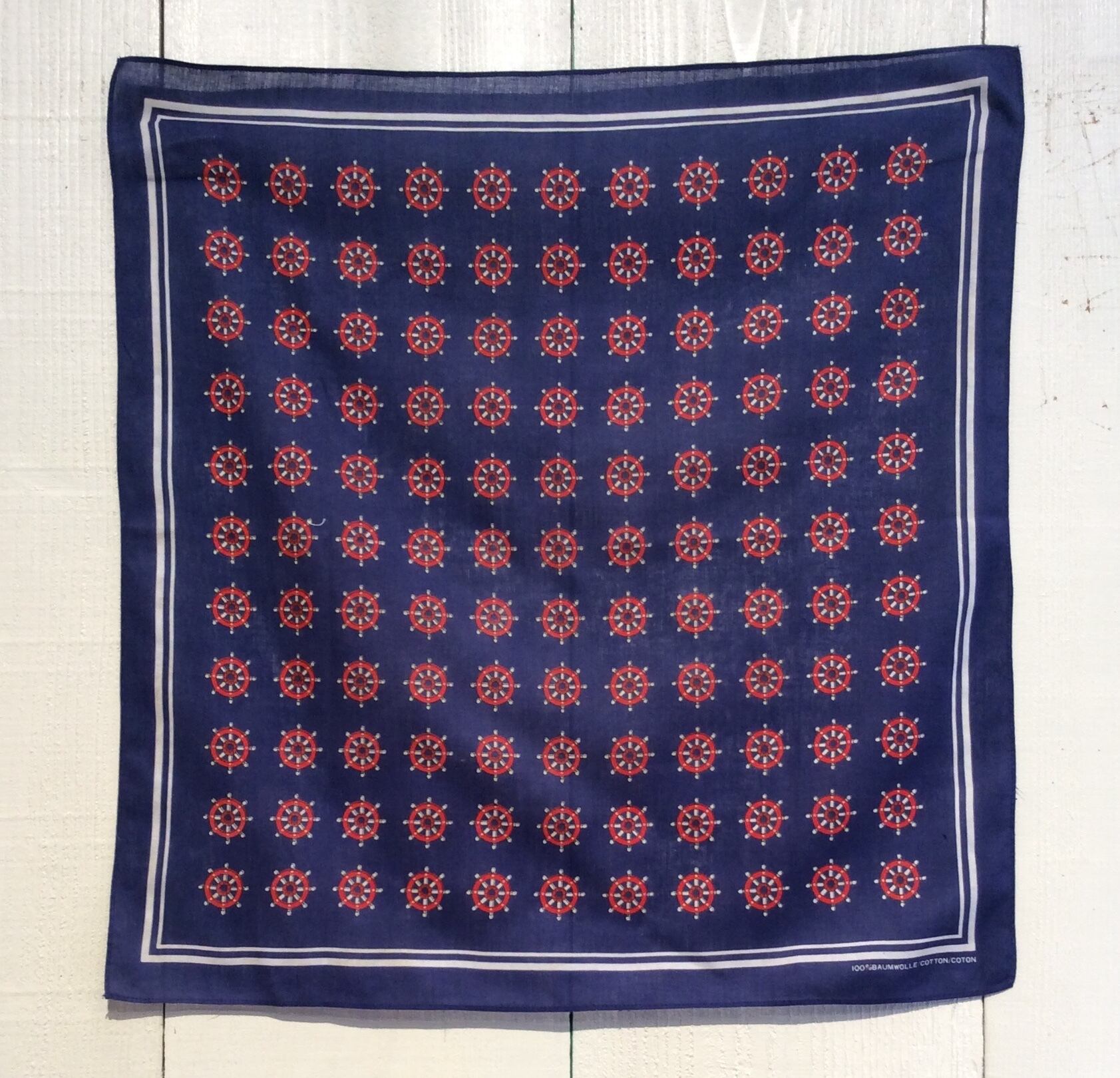 紺色に白・赤・黒の色使いの 船の舵の模様です。