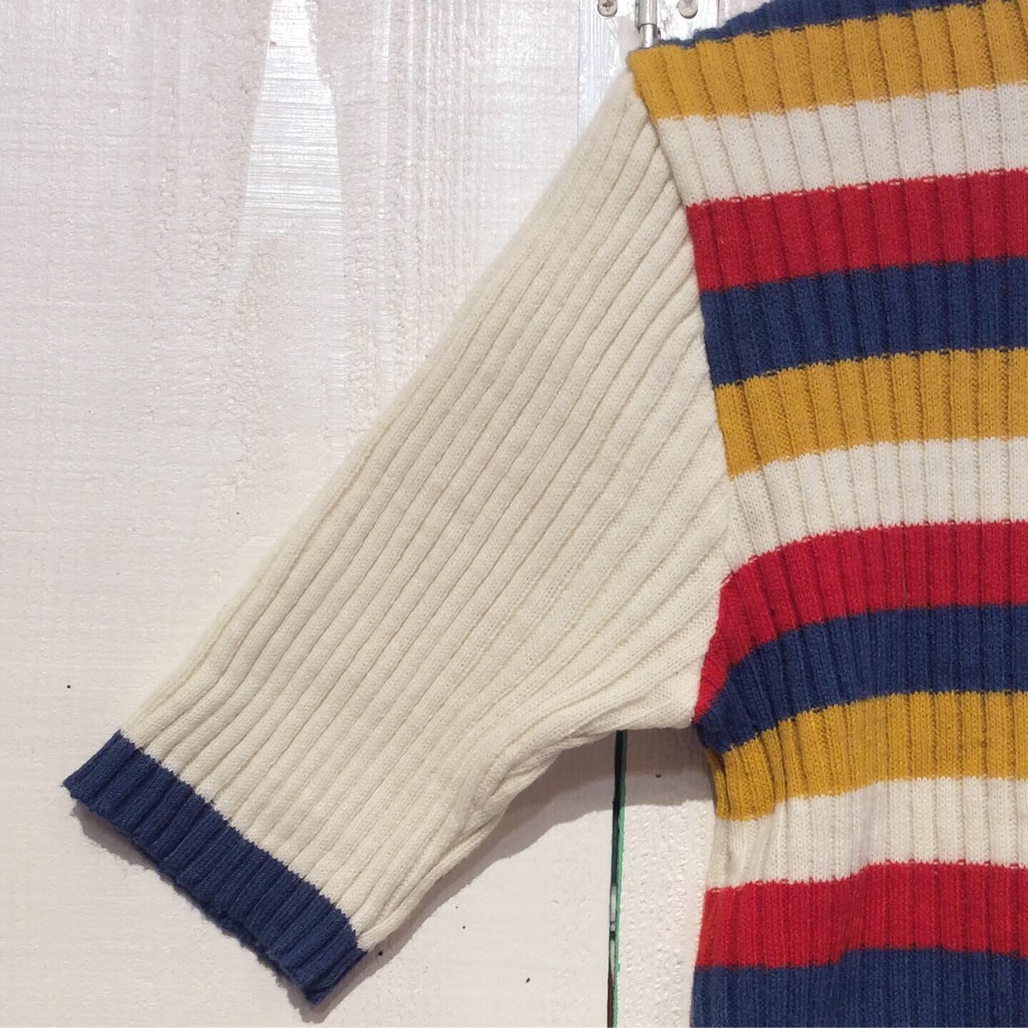 落ち着いた 赤・オフ白・濃いブルー・マスタード色のボーダー柄で
