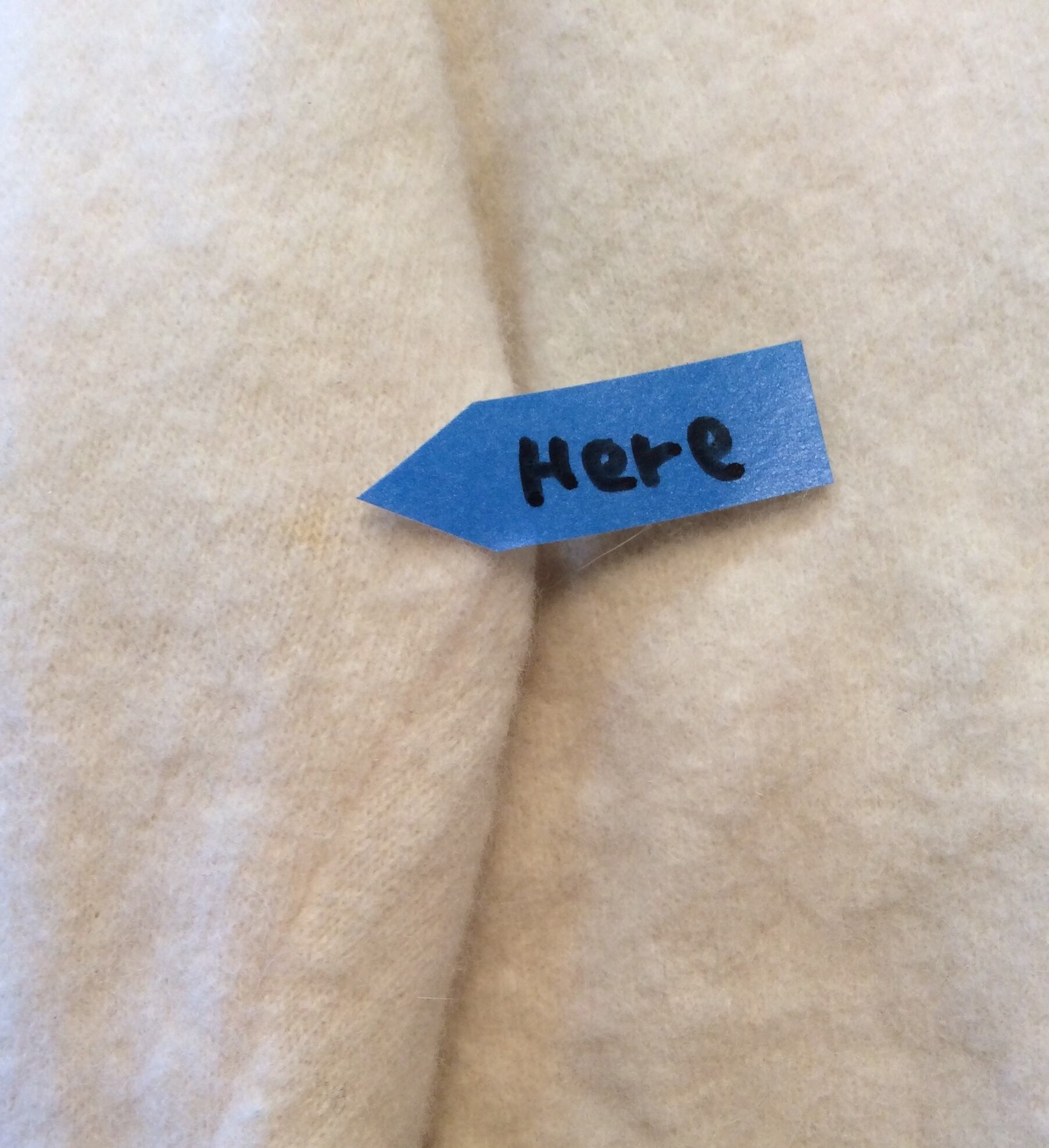 写真16枚目の、薄く小さなシミが左腕の後の内側寄りにあります。