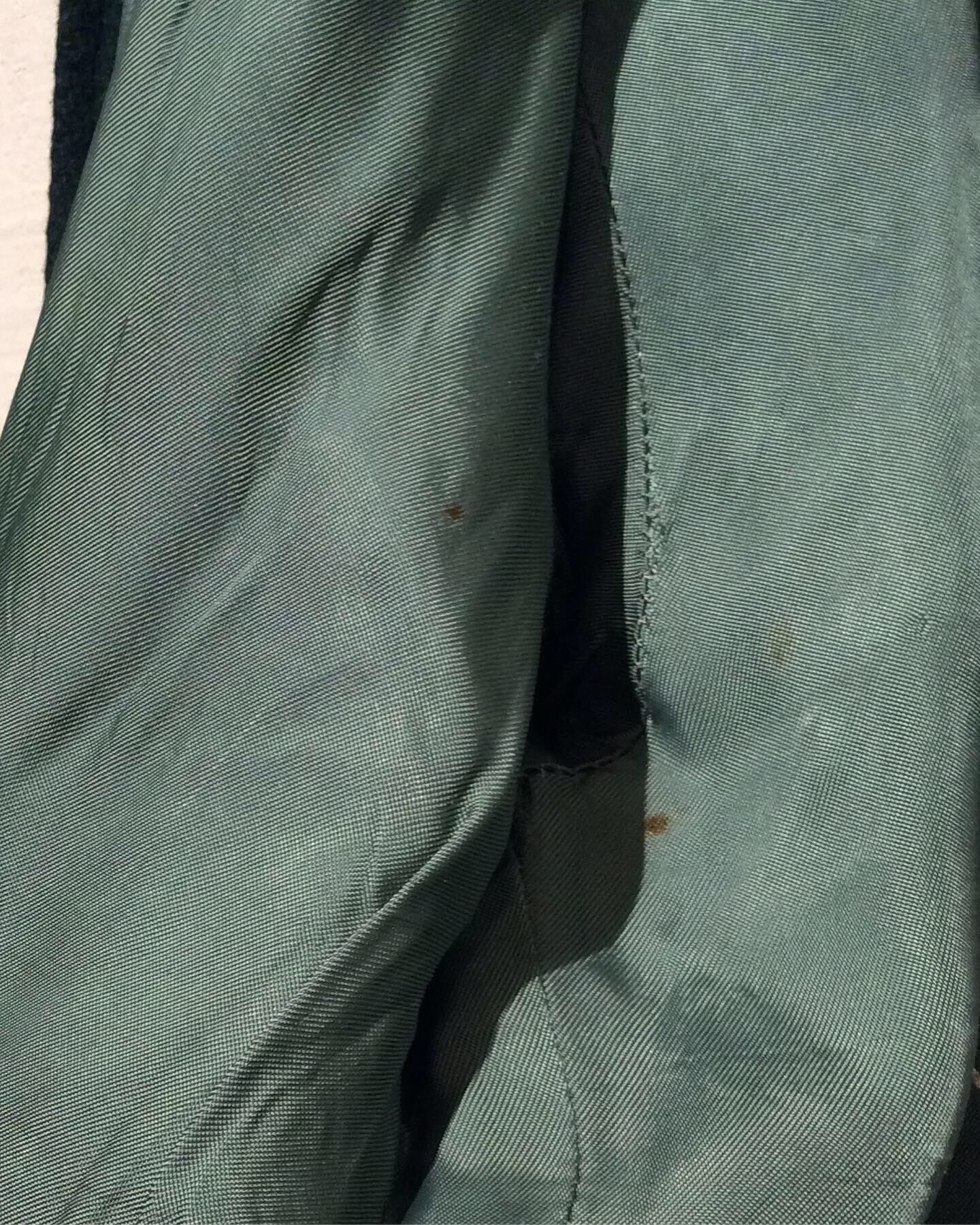 写真15,16枚目 両脇の下 革の部分に 身頃の緑いが