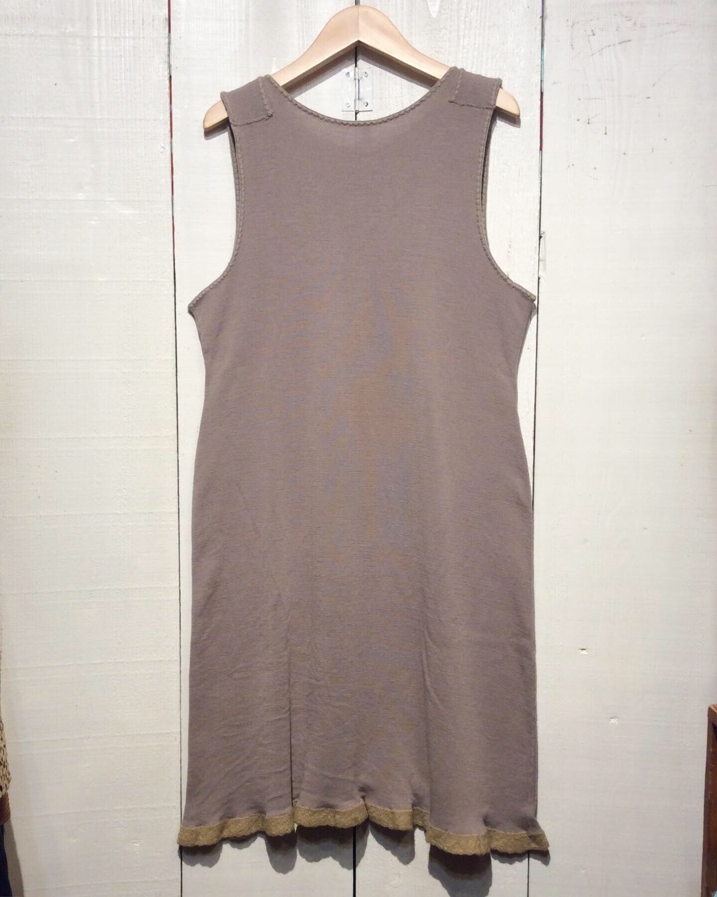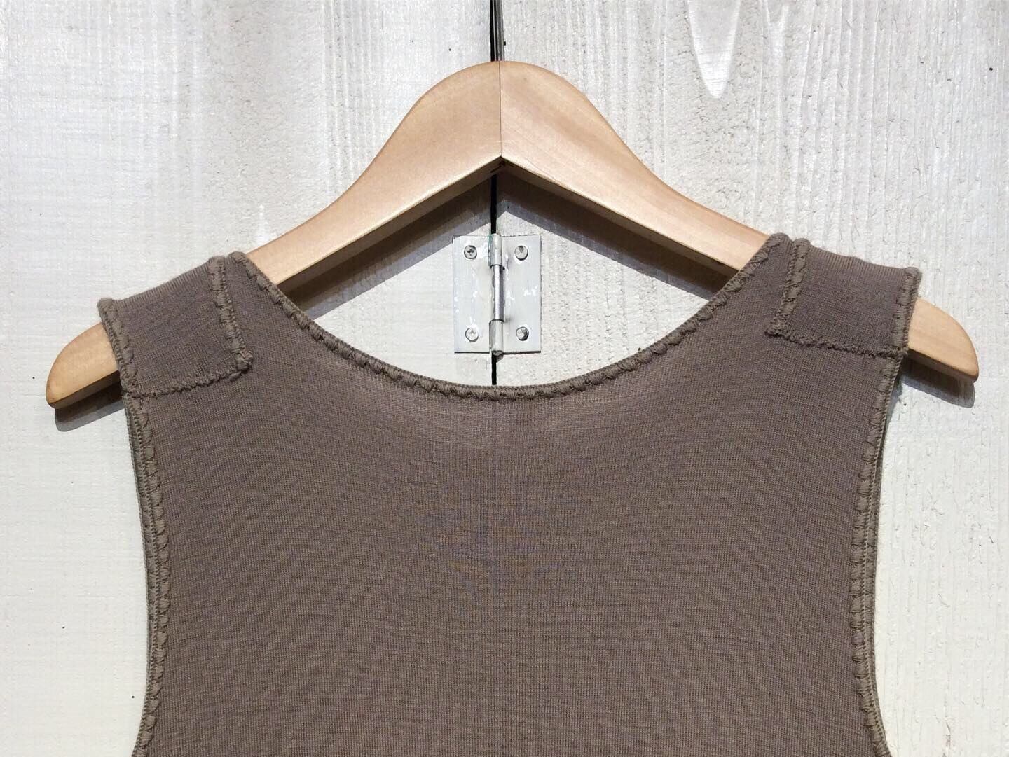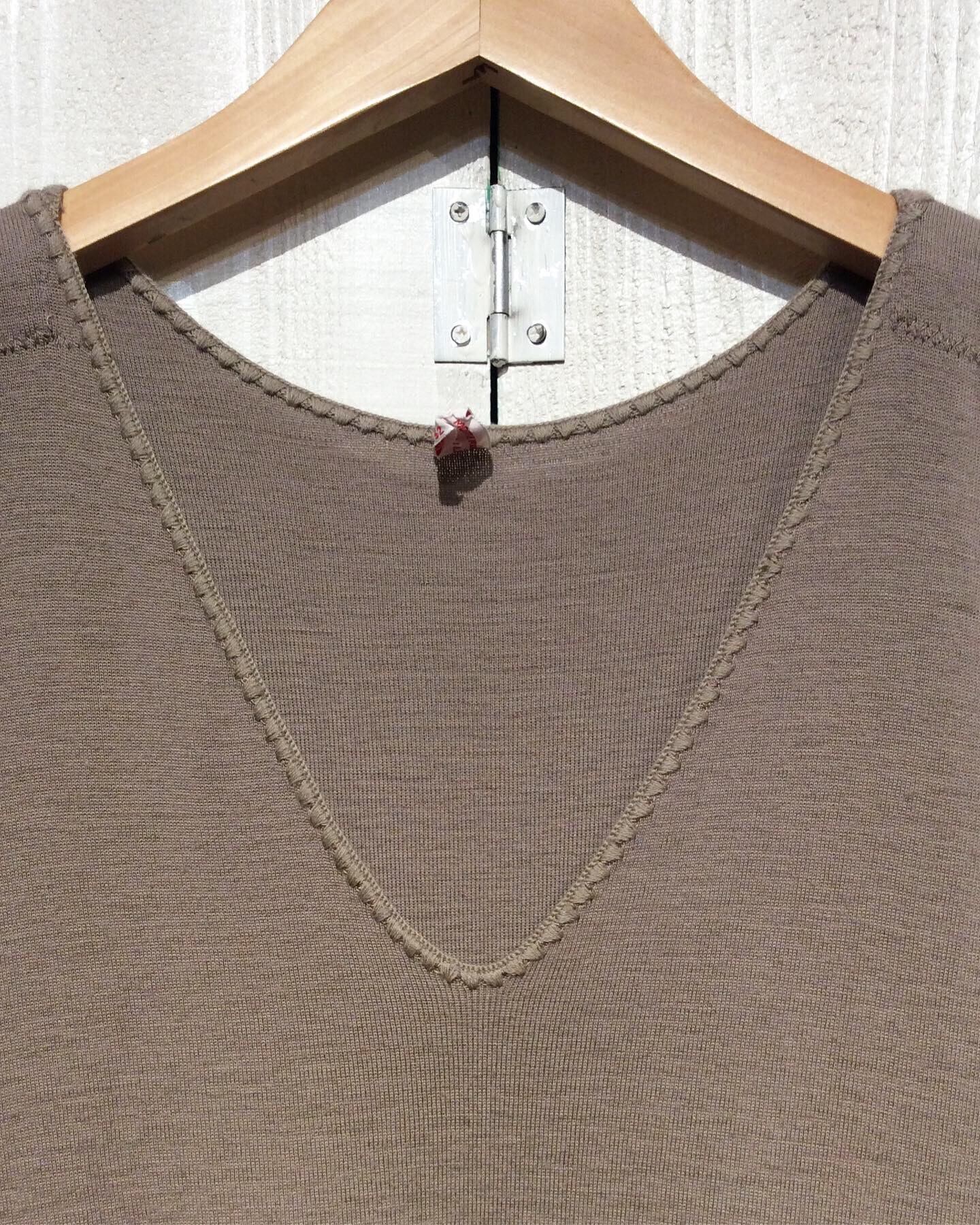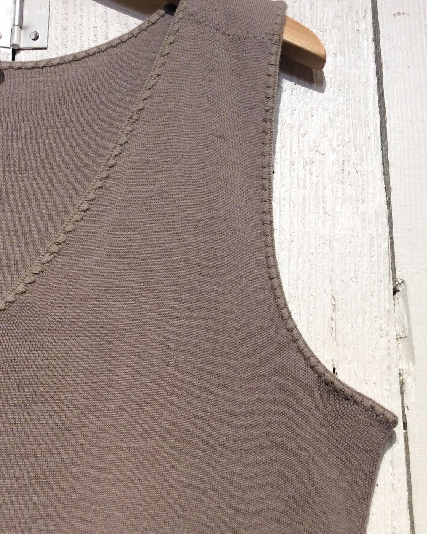 Vネックで、首元・脇・裾が細いニット糸で縁取りされています。