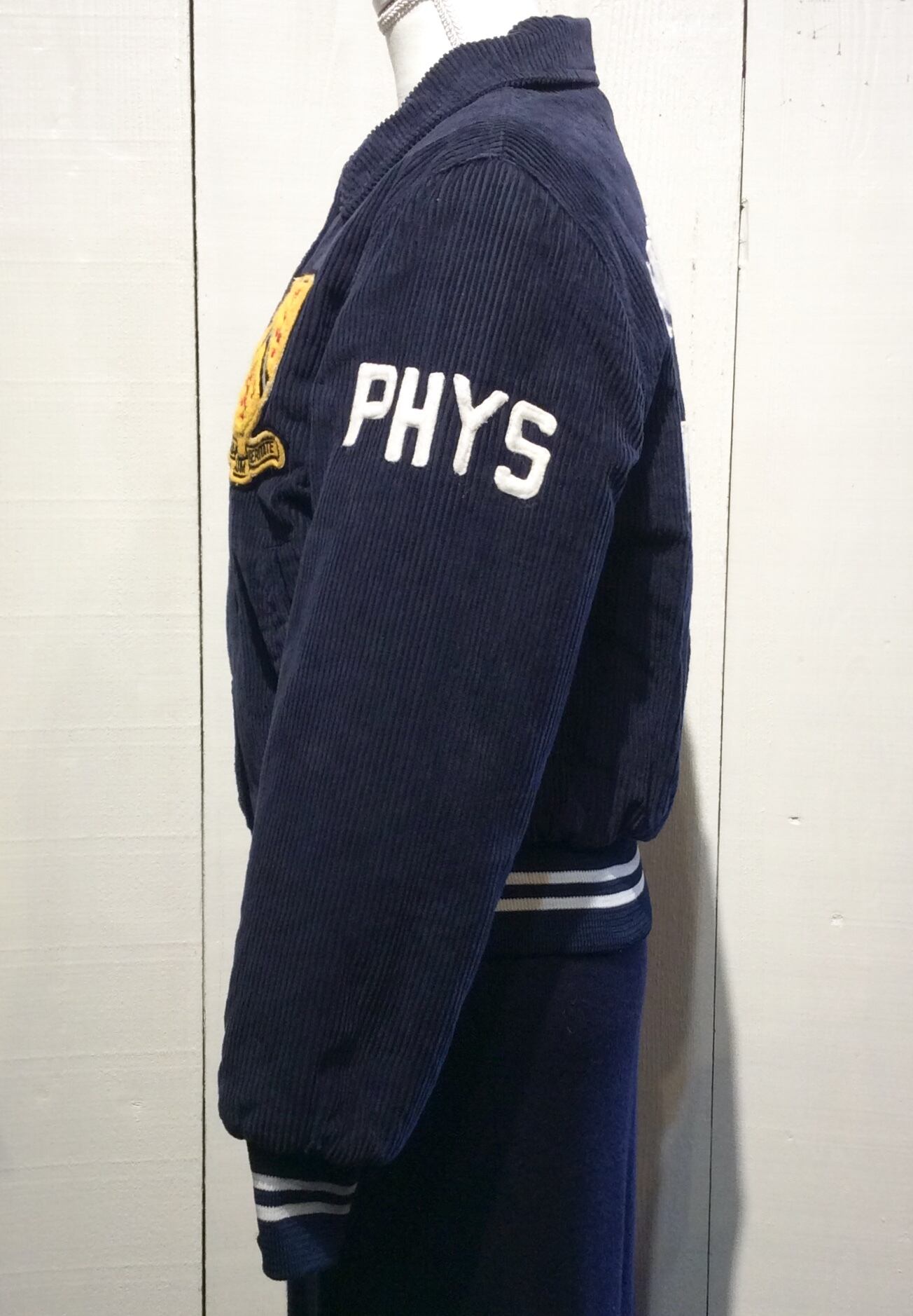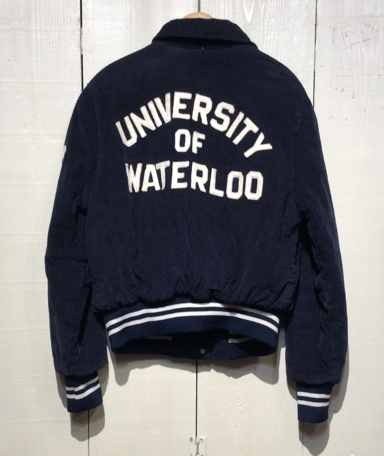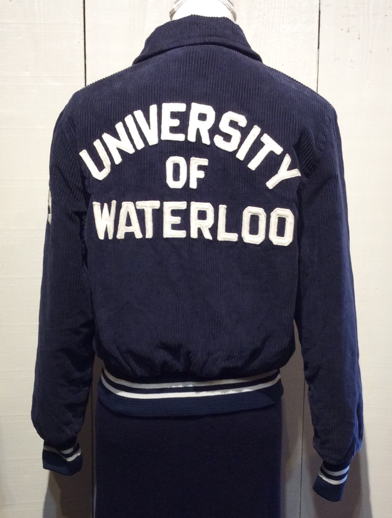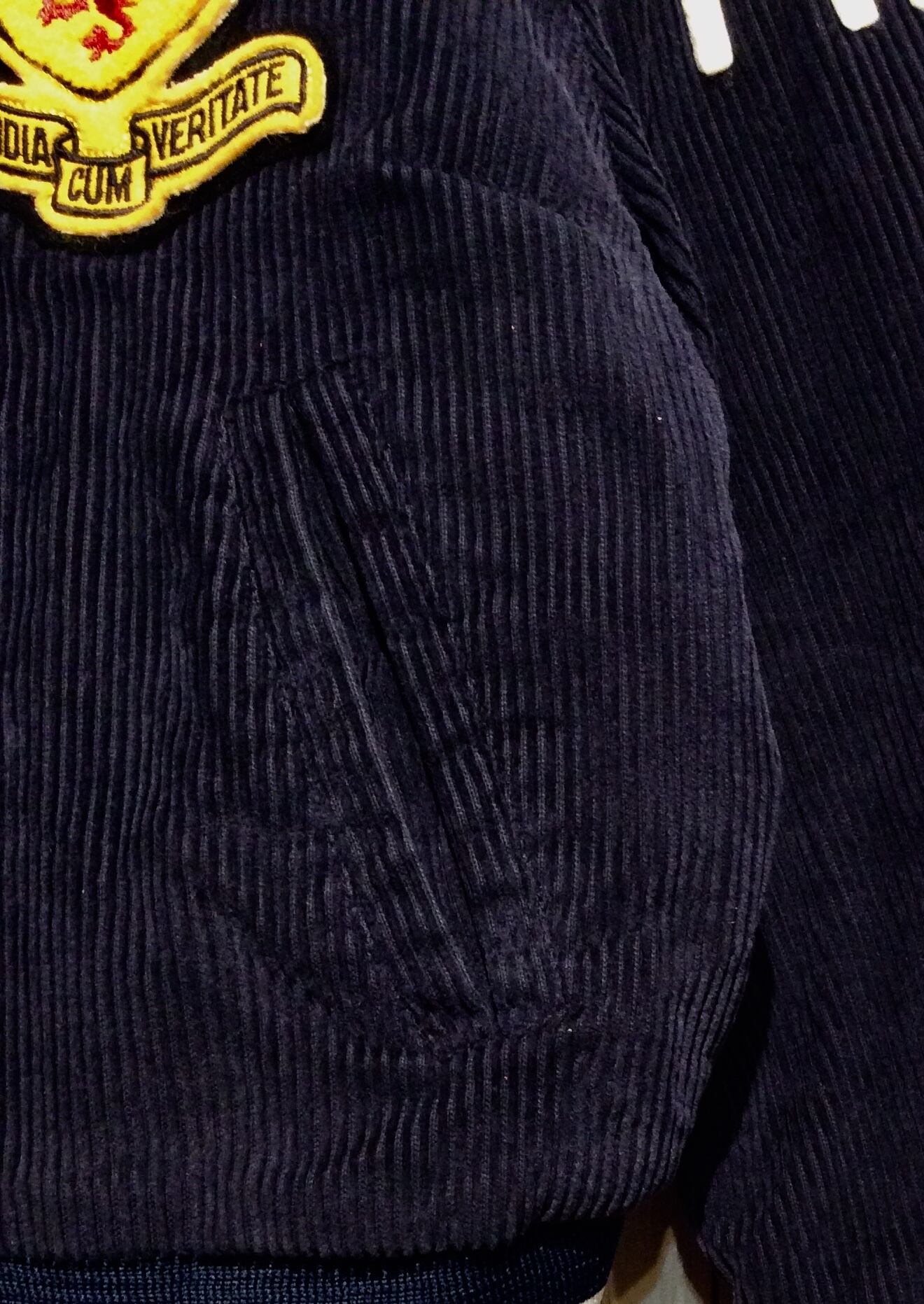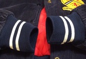 袖と裾のリブは、紺色に白のラインのポリエステル系の素材になります。