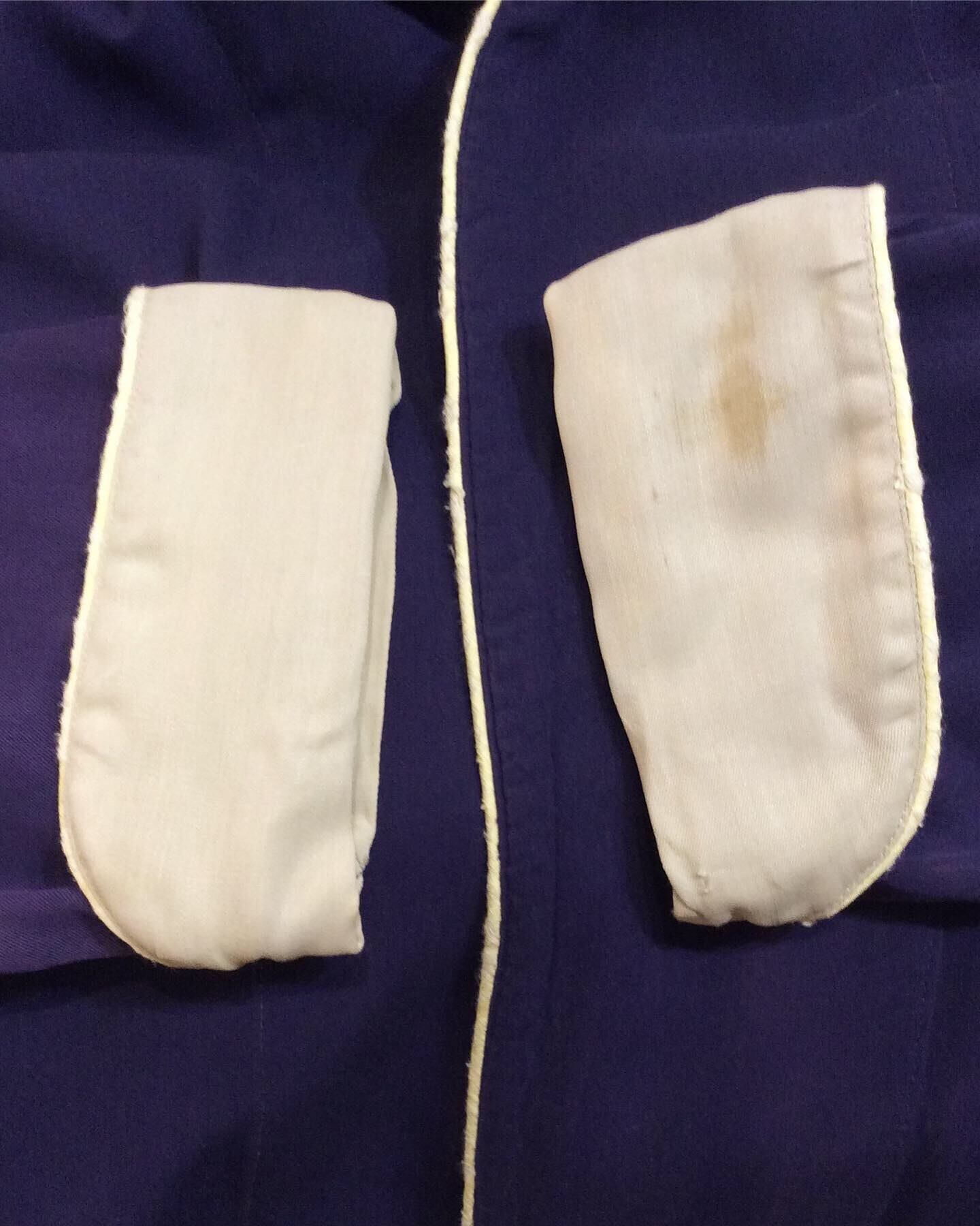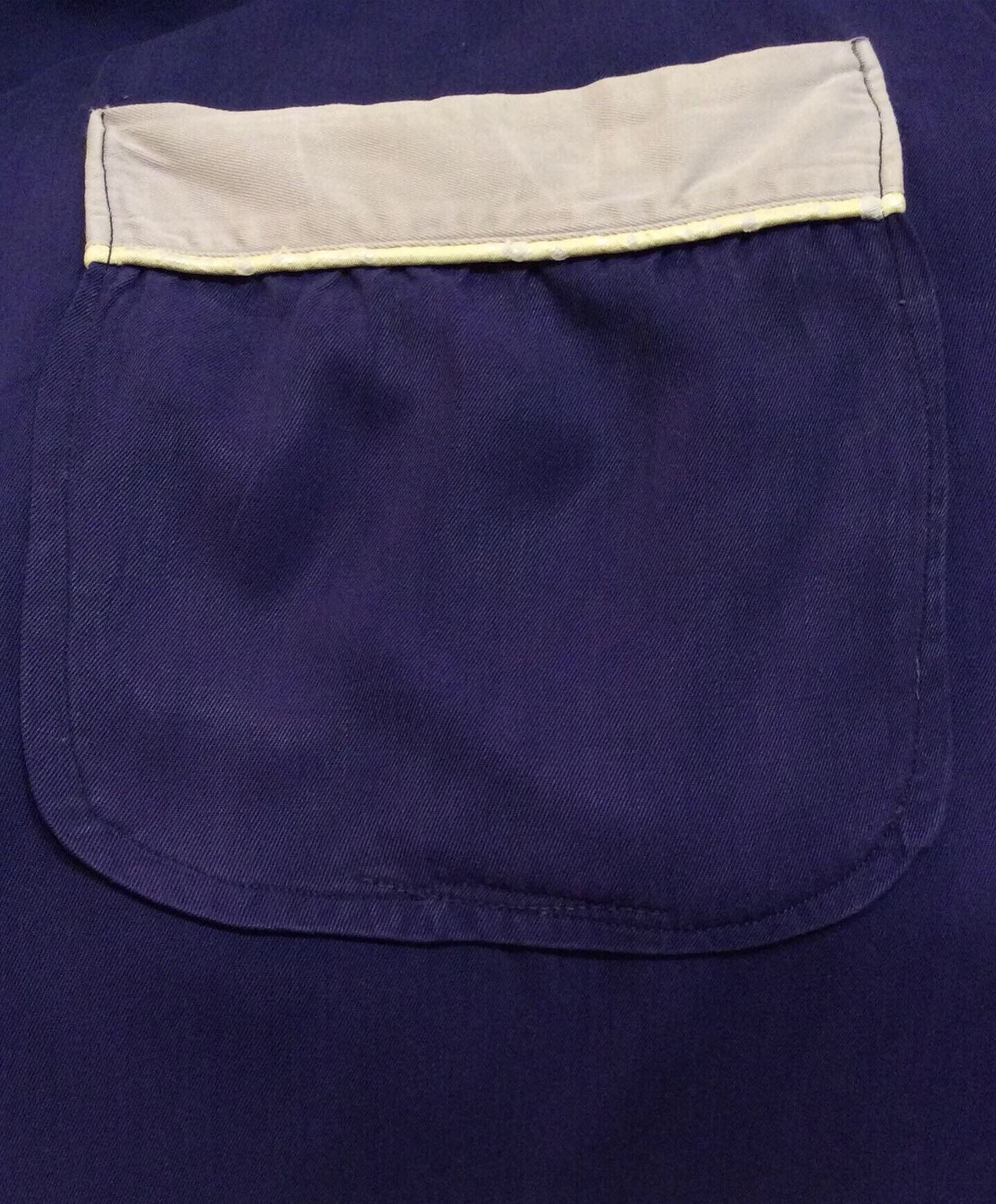 ネイビーとライトグレーの2色使いで、襟・ポケット・カフス端に白のパイピングがほどこされています。