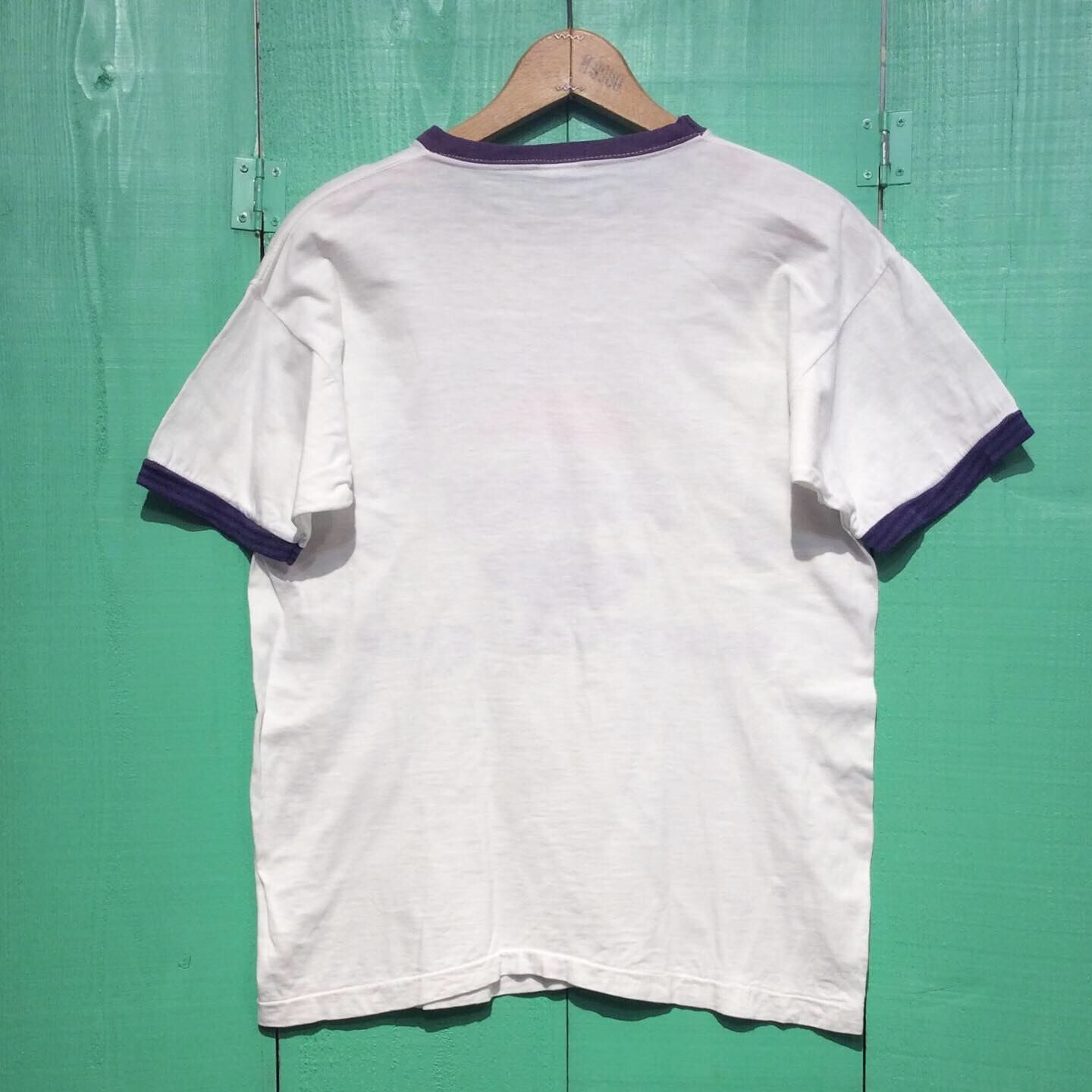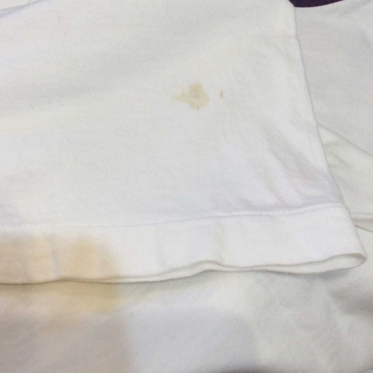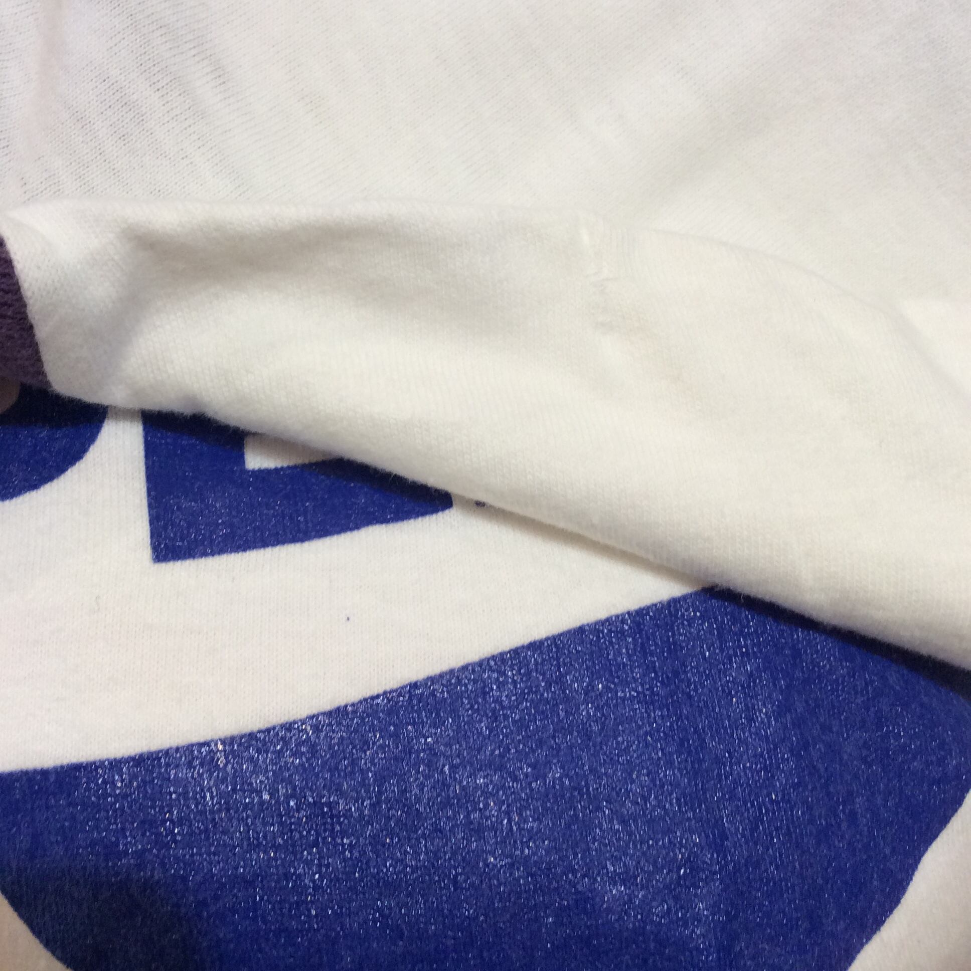 色は 白で、首と袖口まわりがおそらく紺色が色抜けしたパープルのトリムで、