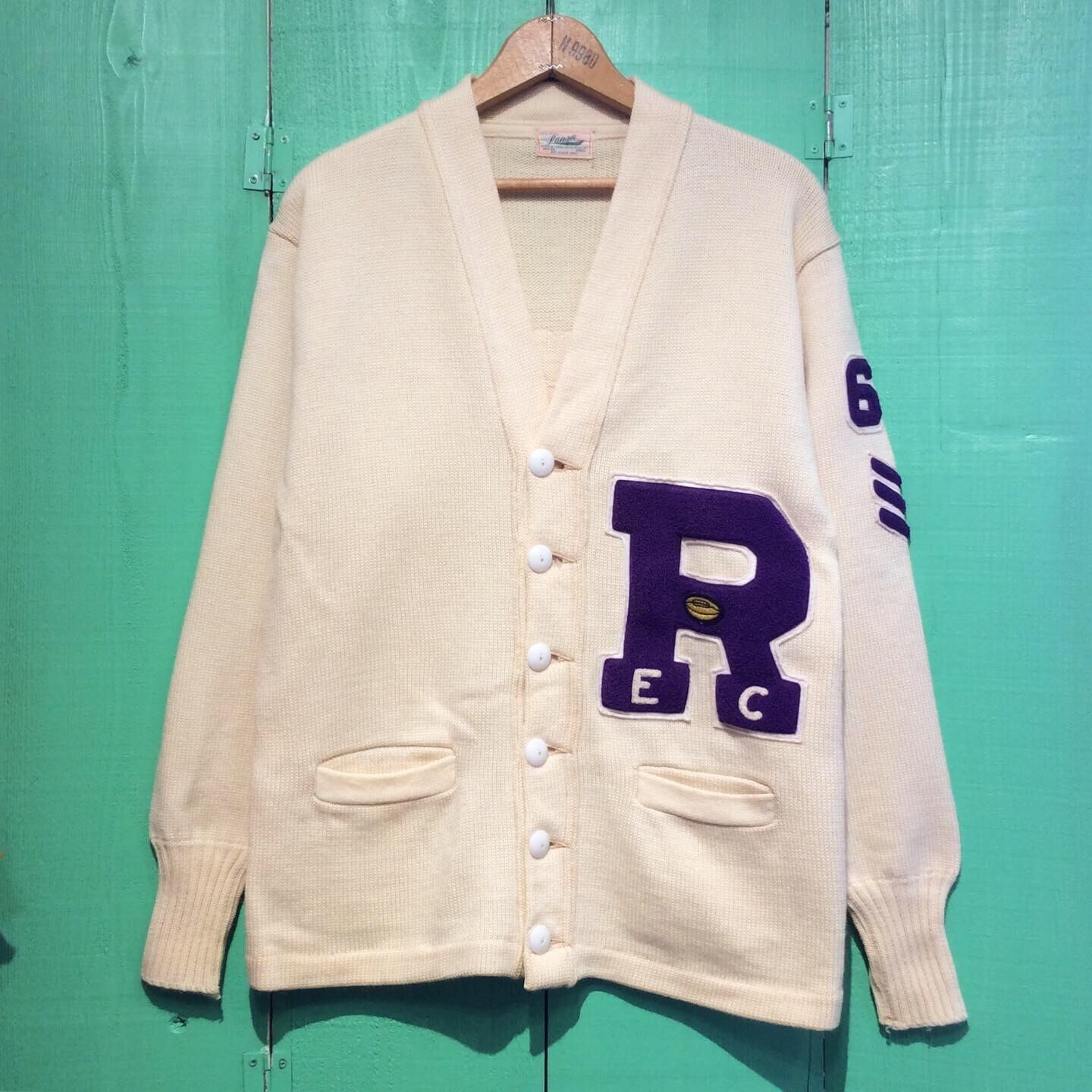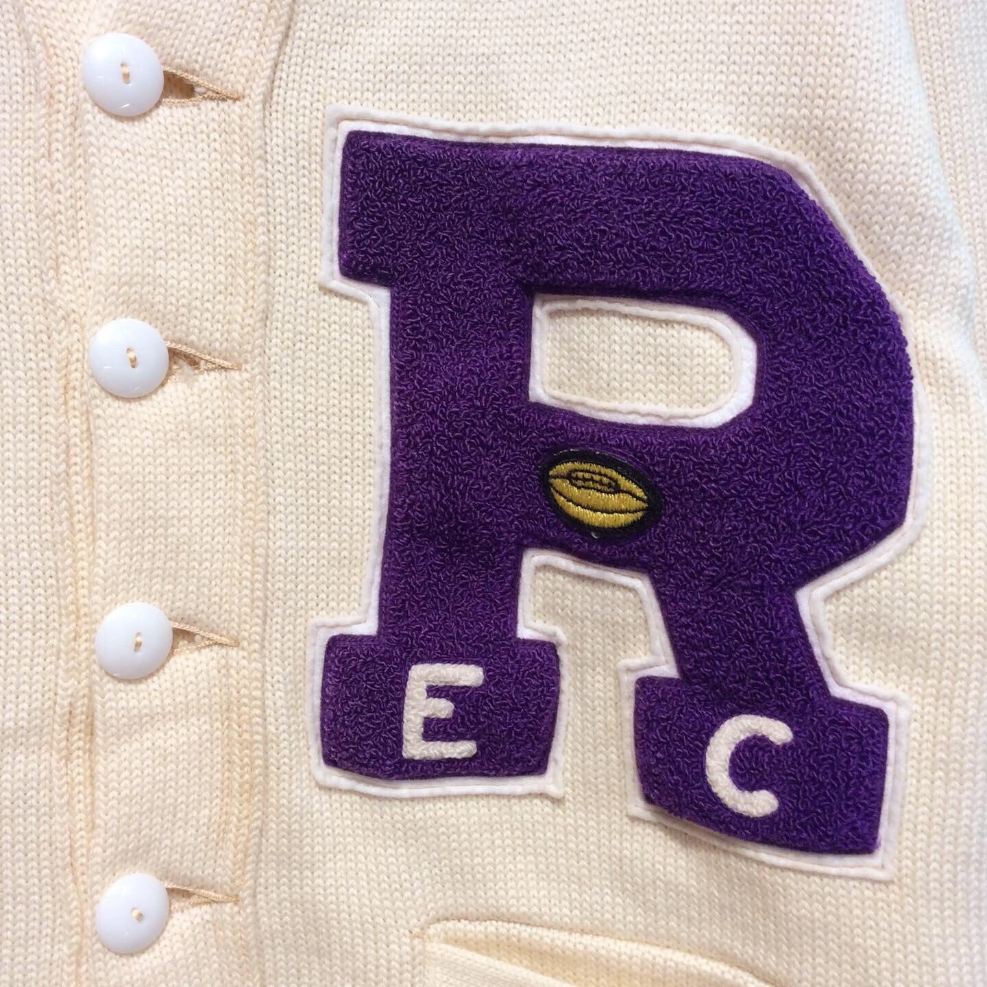 左胸・左腕・背中に、紫色のパイル織りワッペンが縫いついています。