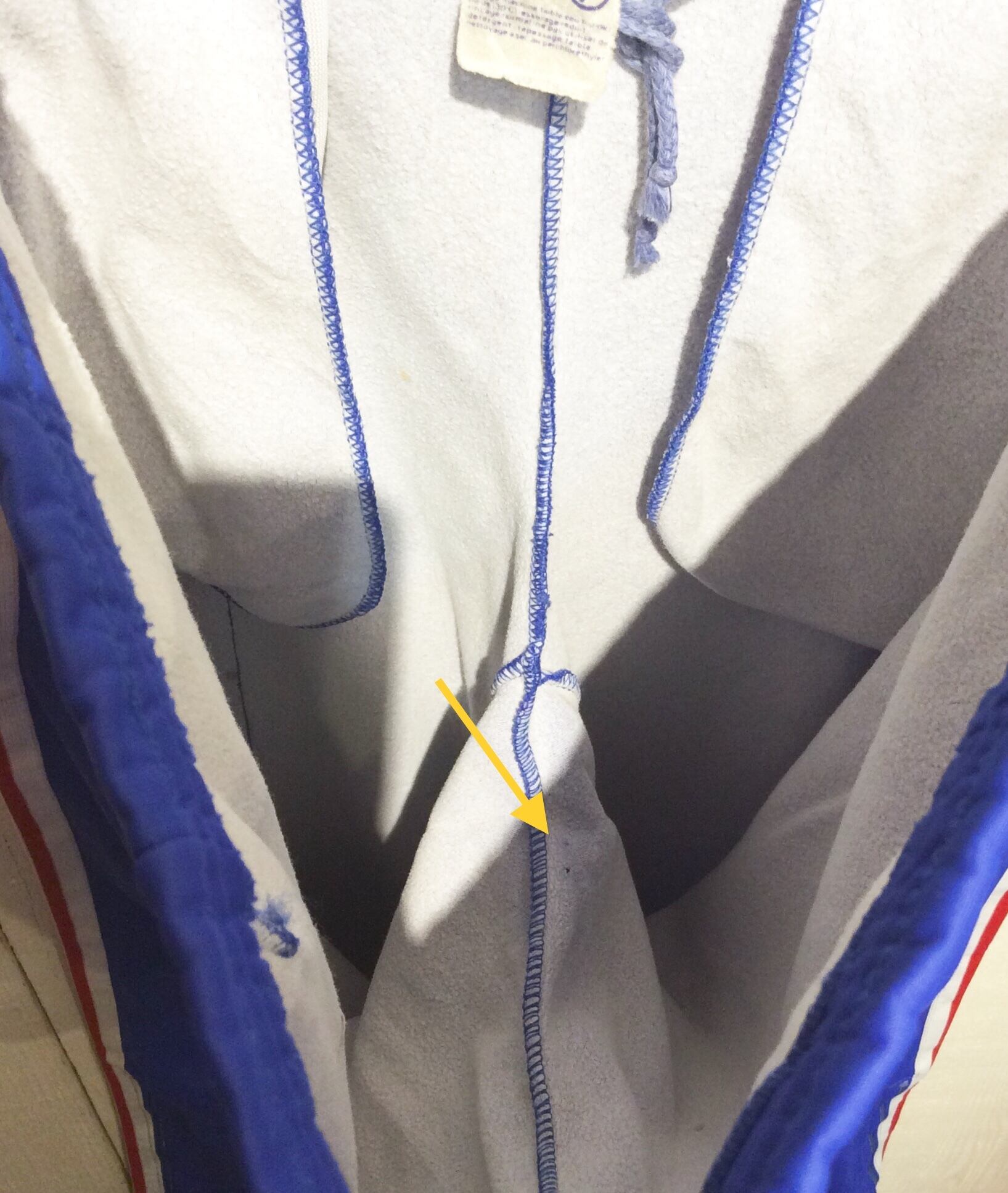 写真11・12枚目 股間付近内側の起毛が他より少し薄めなのと、ホチキスの針跡の様なピンホールが有ります。