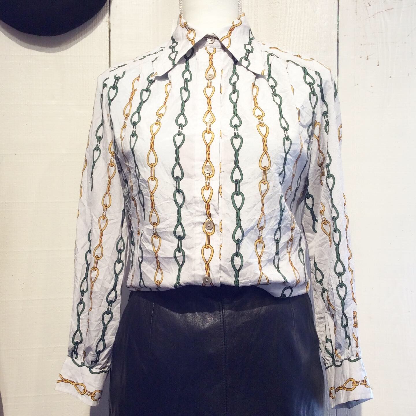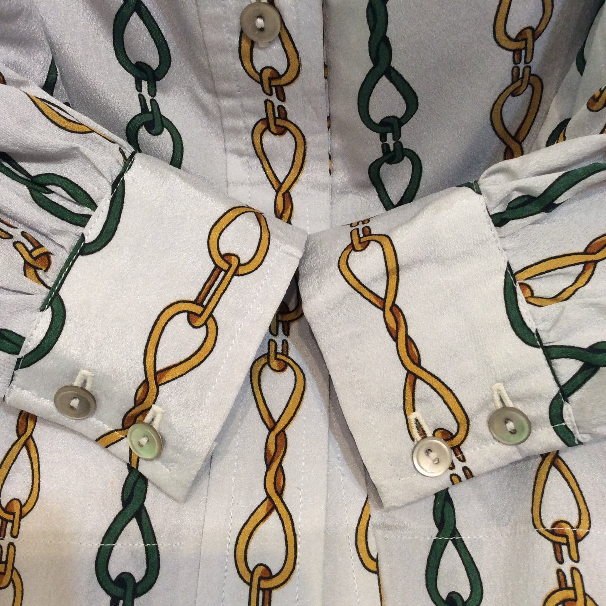 素材は、ポリエステルで、シャカシャカ感のある梨地の様な手触りのブラウス生地です。